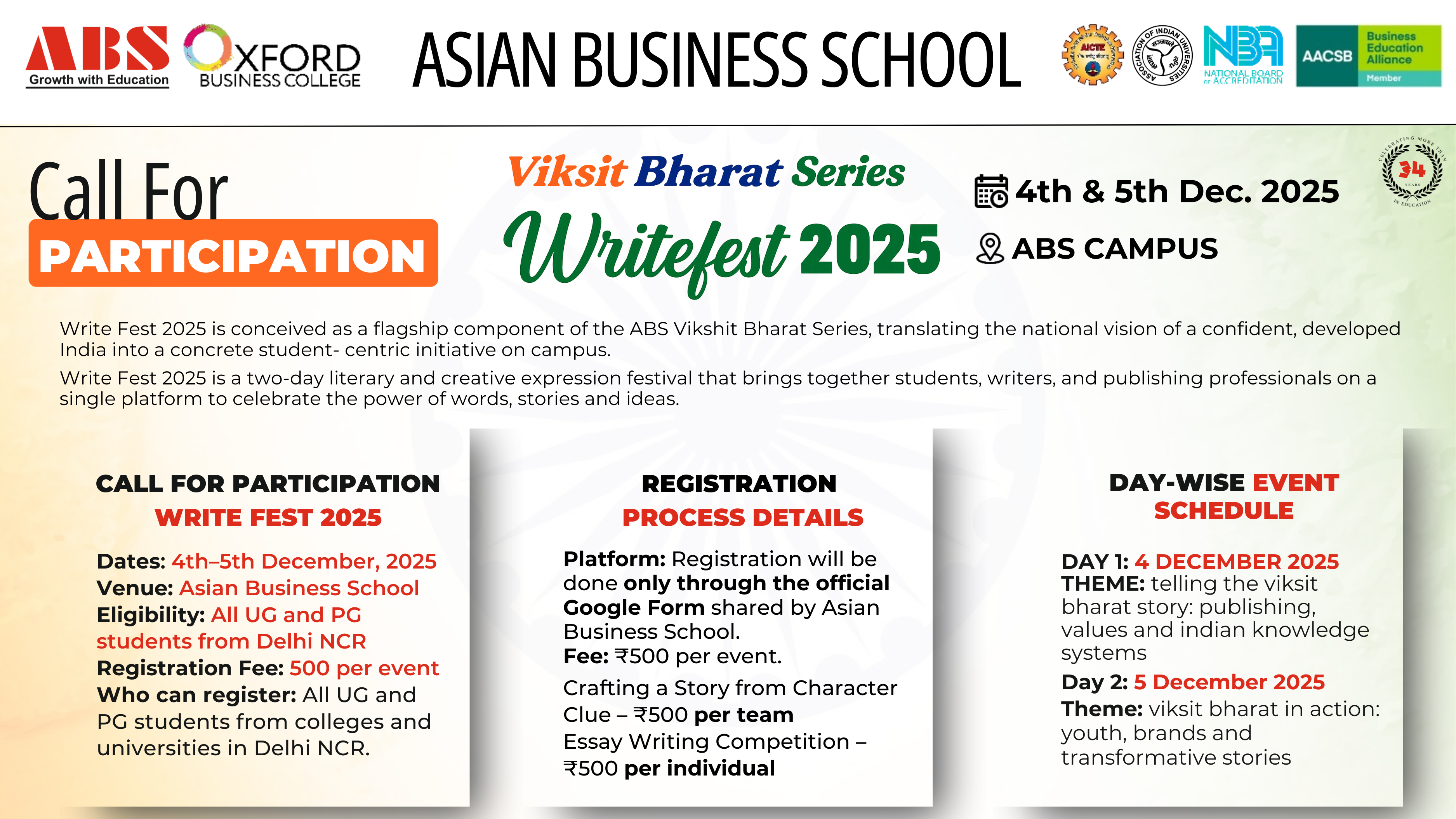 Write Fest 2025 is conceived as a flagship component of the ABS Vikshit Bharat Series, translating the national vision of a confident, developed India into a concrete studentcentric initiative on campus. While Viksit Bharat 2047 emphasises a knowledgedriven, self-reliant and value-rooted nation, Write Fest operationalises this by sharpening exactly those capacities that a developed India needs most: clear thinking, powerful writing and responsible public expression. By bringing together industry experts, practising authors and student writers on one platform, the fest nurtures creative confidence, critical inquiry and articulate citizenship among young learners. In doing so, it treats every participant not just as a competitor in a literary event, but as a future knowledge leader whose words, stories and ideas will shape the cultural, ethical and intellectual foundations of a truly Viksit Bharat.